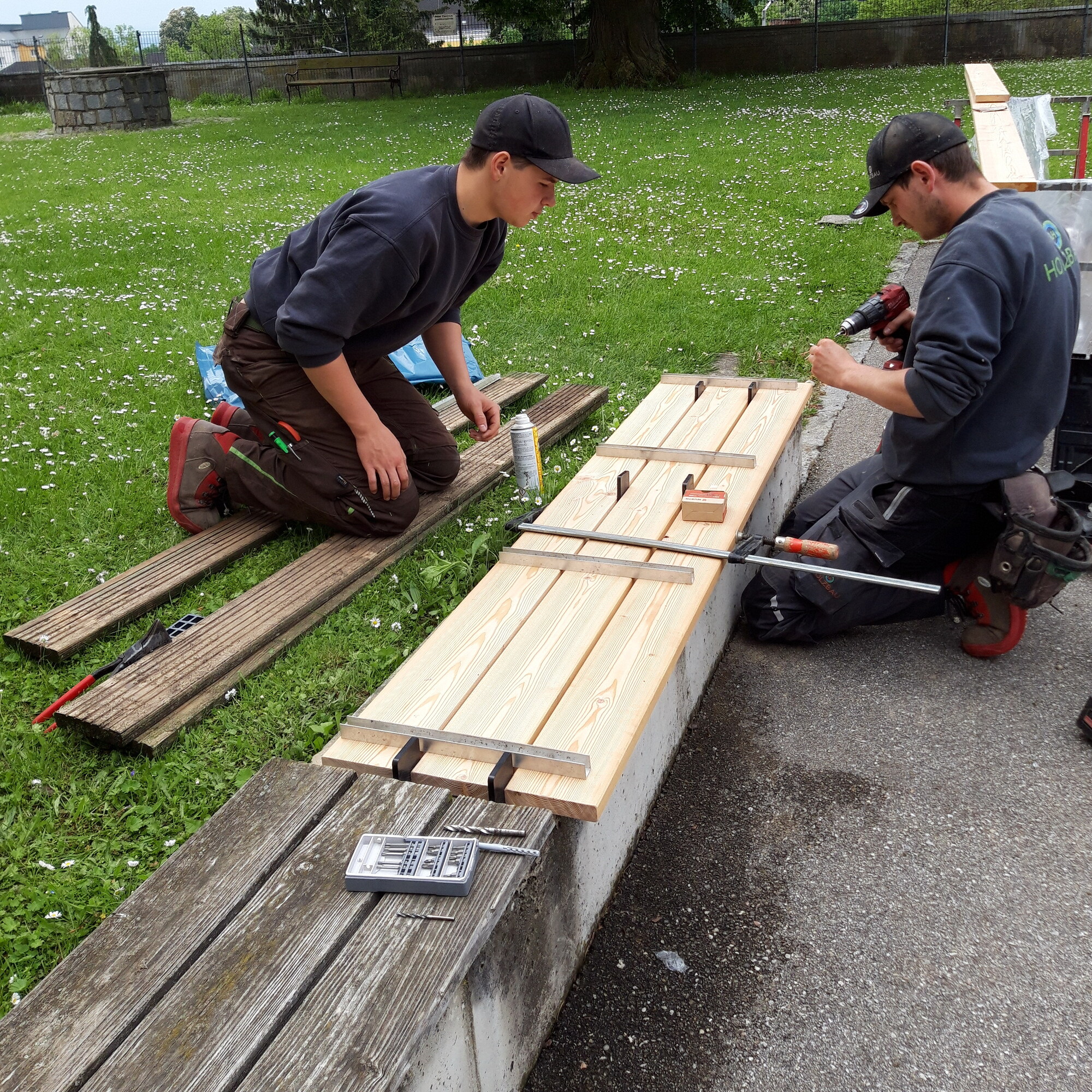 Neue Sitzbank und neues Schindeldach über dem Kreuz bei der Pfarrwiese