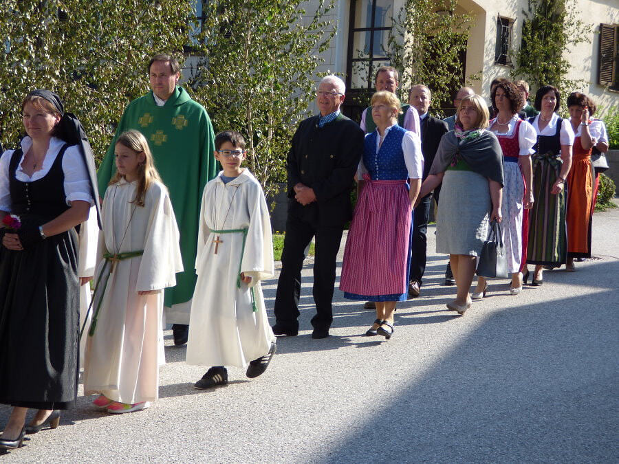 Unser Erntedankfest fand heuer bei einem herrlich sonnigen Wetter statt. Die Firmlinge trugen, begleitet von der Musikkapelle, die von der KFB gebundene Erntekrone in die Kirche. Beim Festzug ging die Goldhauben- und Kopftuchgruppe mit den Häubchen-Mädchen mit, sowie die Religionslehrerin mit den Kindern der Volksschule.